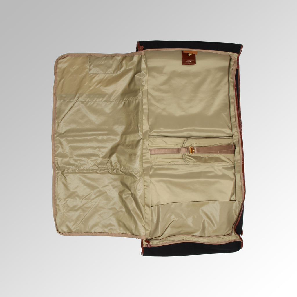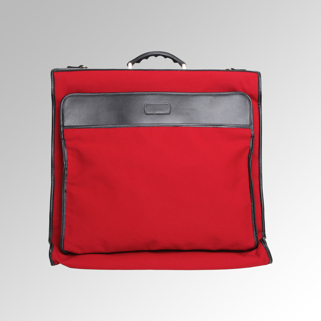 Sophisticated in style, our canvas and leather carry-on garment bag accommodates up to 5 suits or dresses with the ability to use your own hangers. There are two large exterior zip pockets for shirts, shoes and other accessories which can be securely stowed for travel. Patented locking hanger fixture - Two large outside zip pockets - Removable, adjustable shoulder strap - Door hook.