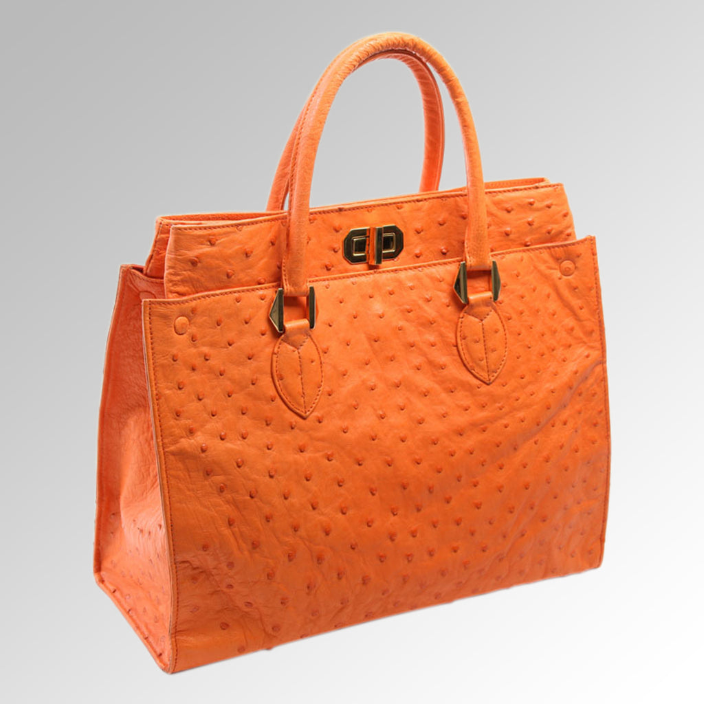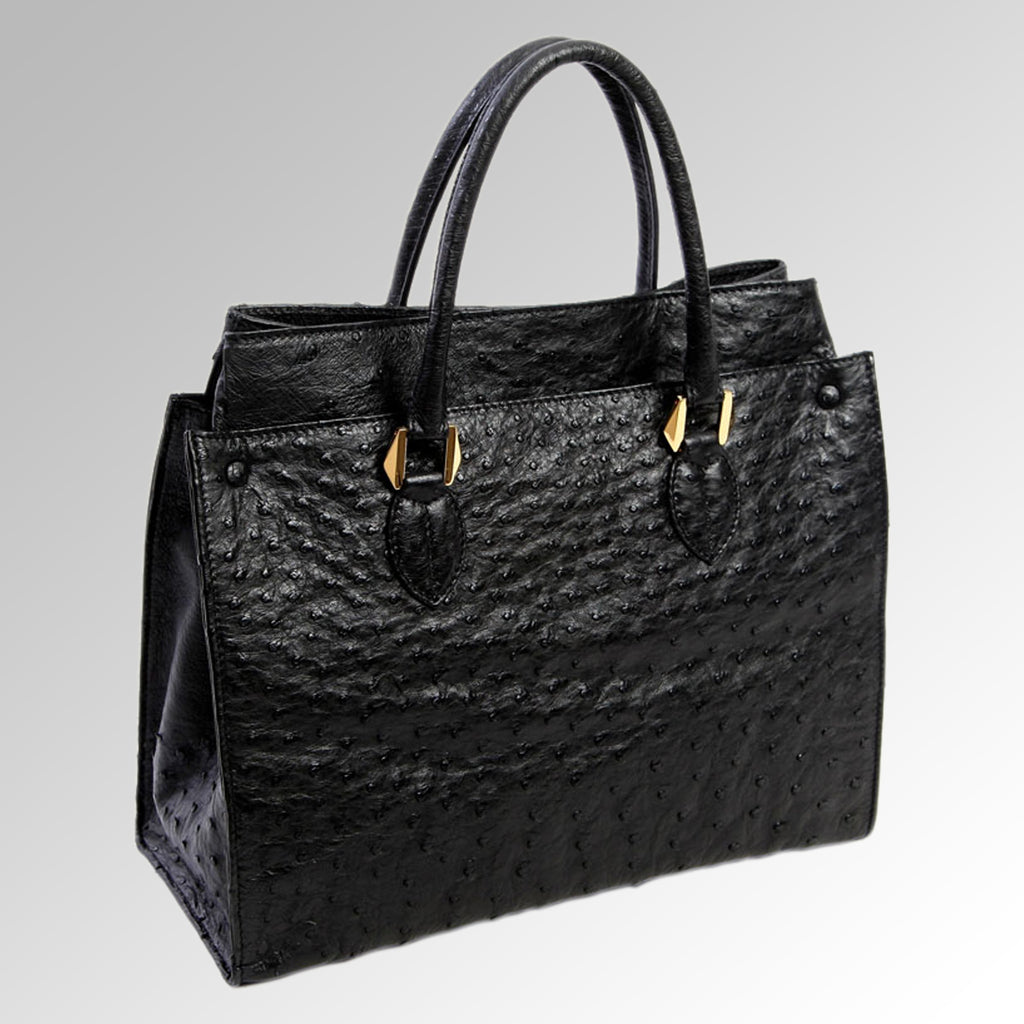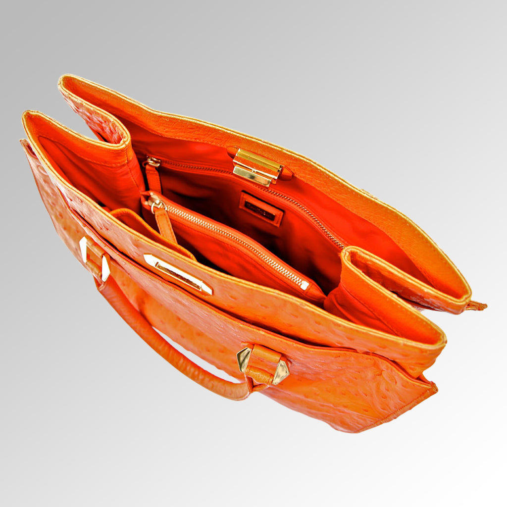 Roomy main compartment. Two exterior open compartments. Two interior zippered compartments. Interior phone compartment. Gold plated fittings.